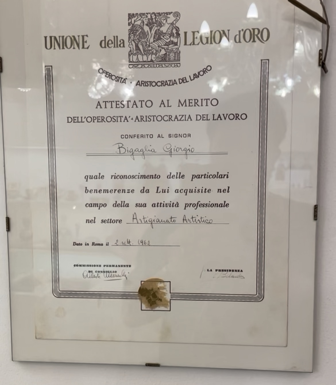 ▲ 1962年発行「黄金の軍団ユニオン」功績証明書。芸術工芸分野でBigaglia Giorgio氏に授与された由緒ある賞状です。