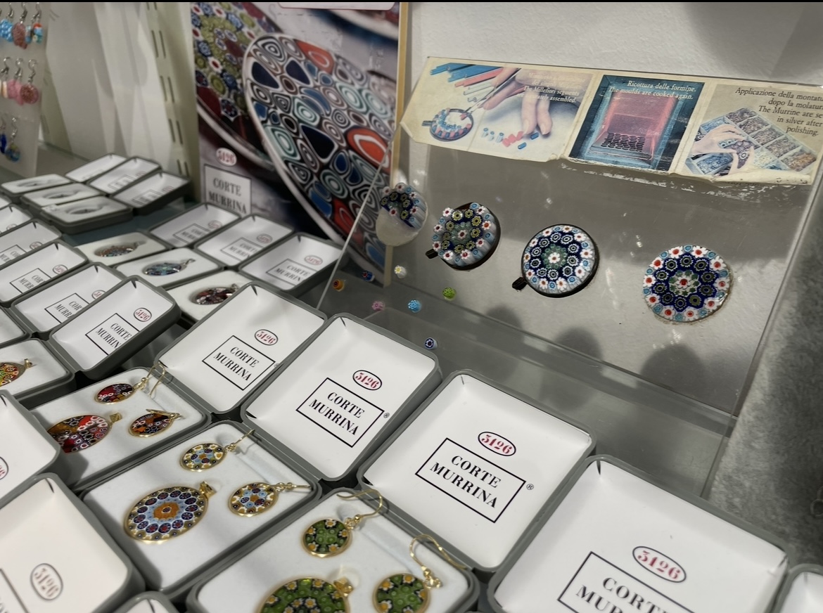 上の写真にあるガラス棒がムリーナです。この細い棒の断面に、すでに精巧な花柄が描かれています。これを輪切りにしてアクセサリーに埋め込むことで、あの美しいミッレフィオーリ模様が生まれるのです。職人の技なしには決して作れない、まさに芸術品と呼ぶにふさわしい工芸技術です。