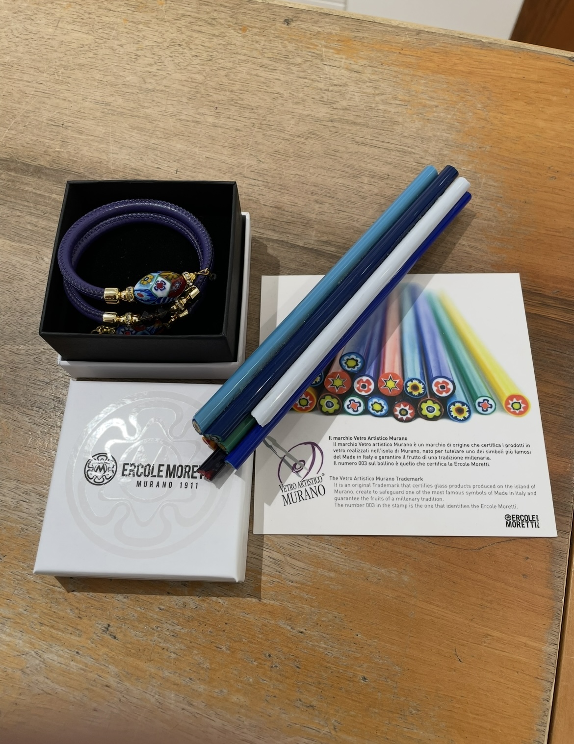 ▲ ムリーナ(ガラス棒)とムラーノガラスのブレスレット。1911年創業のErcole Morettiブランドの正規品です。